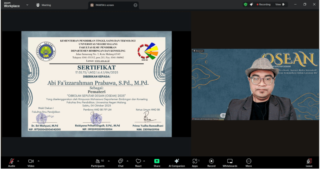 BKPI UIN Salatiga—Dosen Prodi Bimbingan dan Konseling Pendidikan Islam (BKPI) UIN Salatiga, Abi Fa’izzarahman Prabawa, M.Pd., menjadi narasumber pada agenda OSEAN (Obrolan Seputar Desain) yang diselenggarakan Himpunan Mahasiswa Departemen Bimbingan dan Konseling Universitas Negeri Malang, Sabtu, 4 Oktober 2025. Kegiatan berlangsung daring melalui Zoom Meeting pukul 09.00–12.00 WIB dan diikuti lebih dari 100 peserta dari kalangan mahasiswa, konselor, serta praktisi pendidikan.