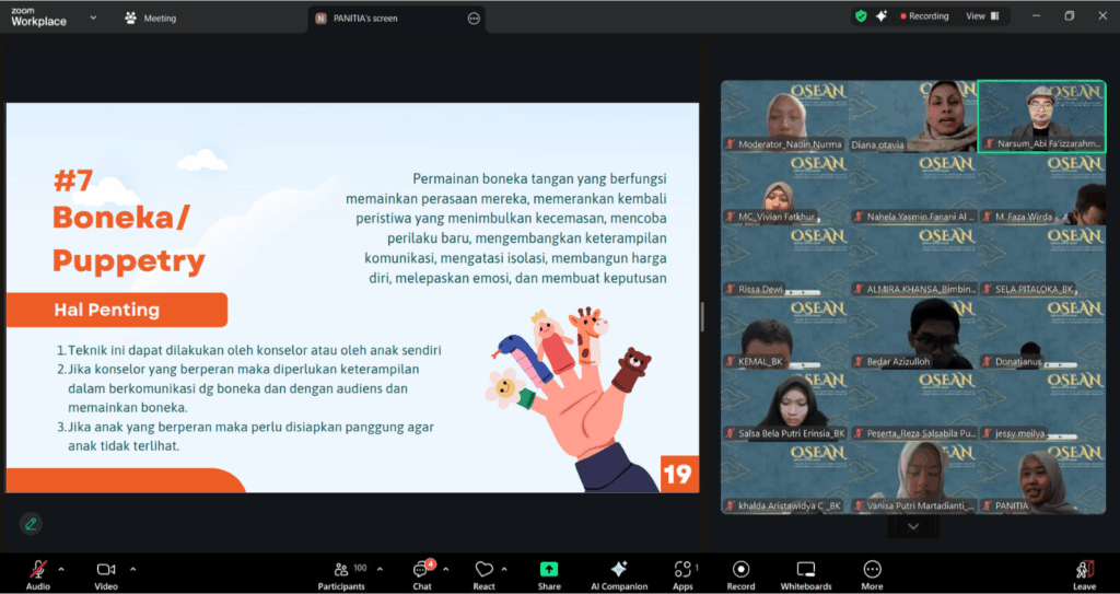 Materi yang disampaikan Abi Fa’izzarahman memetakan “permainan edukatif” sebagai aktivitas menyenangkan yang diposisikan sebagai media untuk mencapai tujuan layanan BK—personal, sosial, belajar, maupun karier. Penekanan utama berada pada prinsip desain: tujuan yang jelas, aturan main yang terstruktur, kemudahan penggunaan, keberulangan (reusable), daya tahan, serta kemampuan permainan untuk memantik ekspresi emosi, kreativitas, dan interaksi konselor–konseli. Pendekatan ini memastikan permainan bukan sekadar hiburan, melainkan instrumen pedagogis dan konseling yang terukur dampaknya.