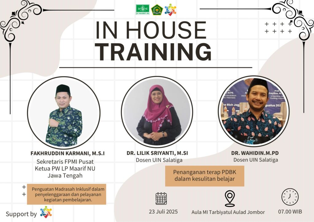 Semarang – Sebanyak 58 guru Madrasah Ibtidaiyah (MI) se-Kabupaten Semarang mengikuti kegiatan In House Training (IHT) Penguatan Madrasah Inklusi pada Rabu, 23 Juli 2025. Kegiatan ini dilaksanakan di MI Tarbiyatul Aulad Jombor, Tuntang, Jawa Tengah.