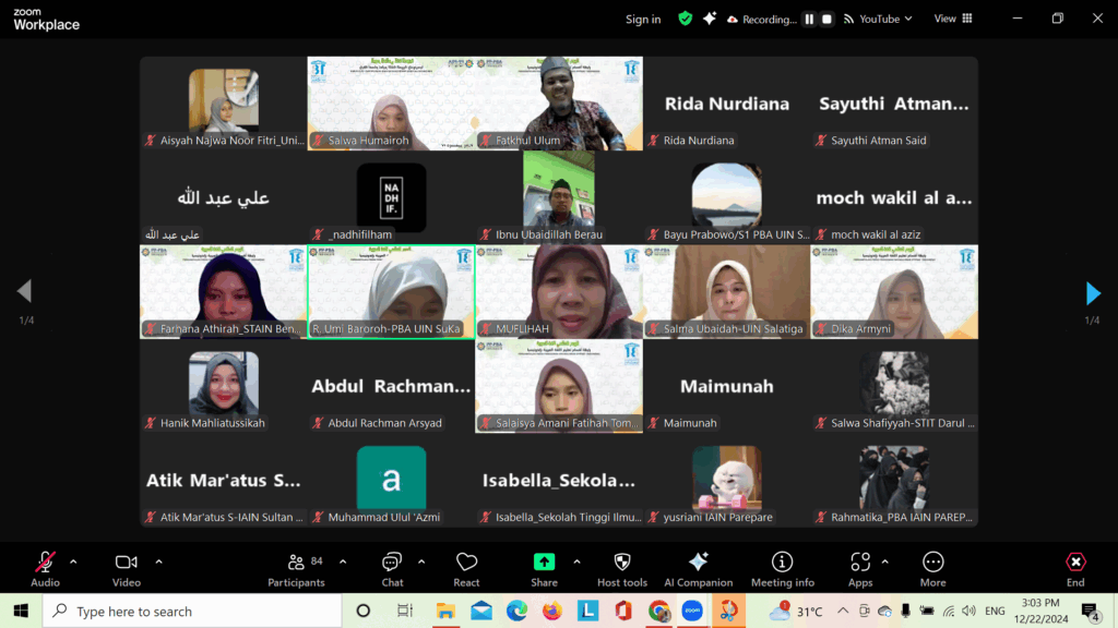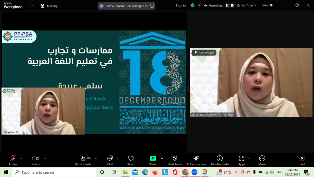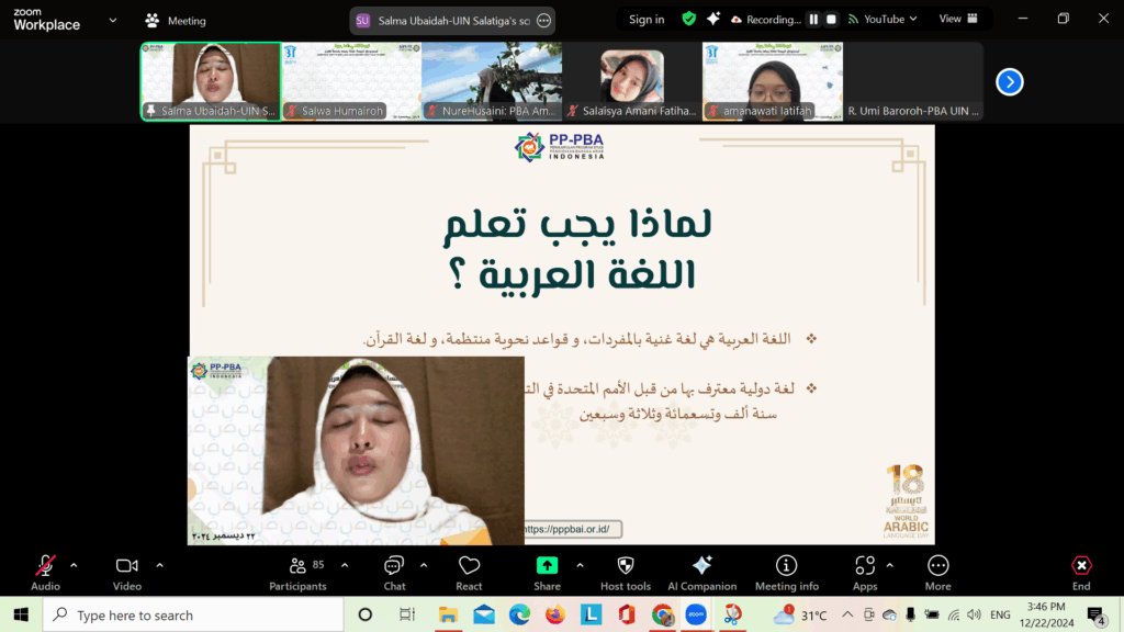 SALATIGA – Kabar membanggakan datang dari Program Studi Pendidikan Bahasa Arab (PBA) Universitas Islam Negeri (UIN) Salatiga. Salah satu mahasiswi berprestasi, Salma Ubaidah, berkesempatan menjadi presenter dalam Seminar Internasional yang diselenggarakan untuk memperingati Hari Bahasa Arab Sedunia pada Minggu, 22 Desember 2024.