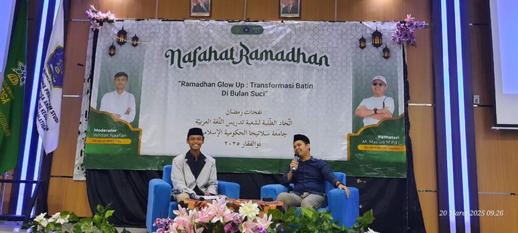 Dalam rangka meningkatkan kesadaran moderasi beragama di kalangan mahasiswa, HMPS PBA UIN Salatiga mengadakan seminar dengan tema “Semarak Ramadhan sebagai momen untuk diri bertransformasi menuju pribadi yang inklusif” pada tanggal 20 Maret 2025 di Auditorium lantai 3 gedung Ahmad Dahlan. Muhammad Mas’ud, M.Pd.I menjadi pembicara dalam seminar ini dan membahas tentang pentingnya moderasi beragama dalam membangun kehidupan yang harmonis dan damai. Dalam acara seminar moderasi beragama, Muhammad Mas’ud, M.Pd.I membahas tentang bagaimana meningkatkan kesadaran spiritual dan waspada terhadap pengaruh negatif dalam kehidupan sehari-hari. Beliau menekankan pentingnya refleksi diri dan meminta perlindungan kepada Allah dalam menghadapi tantangan. Selain itu, beliau juga menyampaikan bahwa kesempurnaan dalam beragama dapat diukur dari peningkatan kualitas diri dari waktu ke waktu.