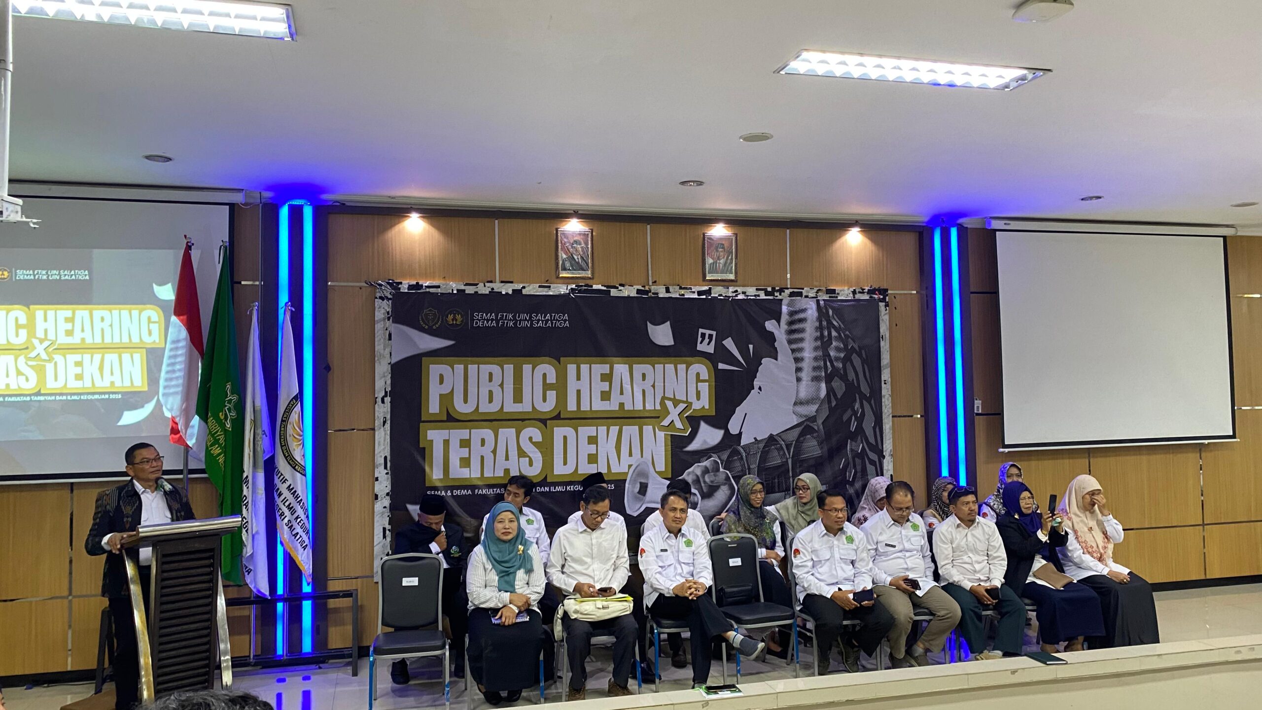 Acara dibuka dengan sambutan dari Wakil Dekan Bidang Kemahasiswaan, Alumni, dan Kerja Sama, Dr. Maslikhah, M.Si.. Selanjutnya, Dekan Fakultas Tarbiyah dan Ilmu Keguruan UIN Salatiga, Prof. Dr. Rasimin, M.Pd. memberikan sambutan dan membuka secara resmi kegiatan Public Hearing X Teras Dekan tersebut.