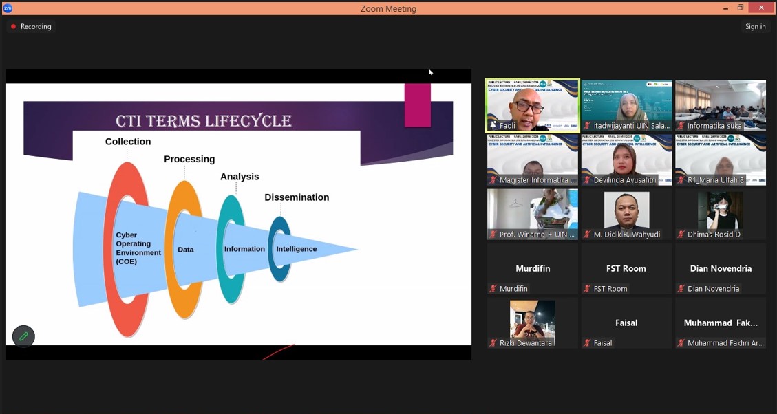 Salatiga, 28 Mei 2025 — Dalam rangka pengembangan diri dan peningkatan wawasan global, dosen dan mahasiswa Program Studi Sains Data UIN Salatiga mengikuti Forum Ilmiah Internasional bertajuk “Cyber Security and Artificial Intelligence” yang diselenggarakan secara daring melalui platform Zoom Meeting.