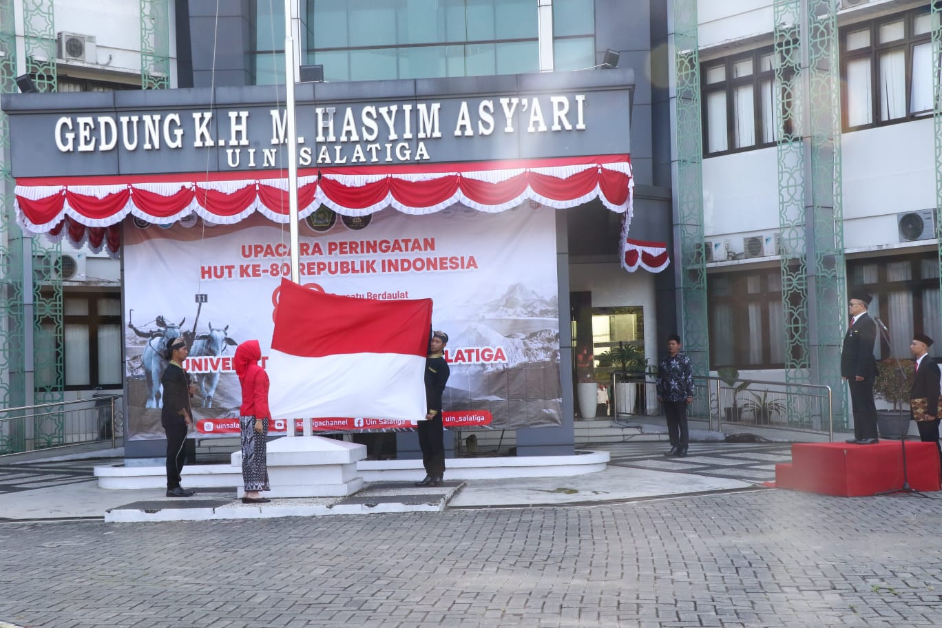 Upacara berlangsung khidmat dan tertib, diikuti oleh Rektor UIN Salatiga selaku inspektur upacara, para pimpinan universitas, dosen, serta karyawan dari berbagai fakultas. Kehadiran seluruh unsur sivitas akademika ini menjadi wujud nyata kebersamaan dalam merayakan hari bersejarah bangsa Indonesia. Dengan mengusung tema nasional “Bersatu Berdaulat. Rakyat Sejahtera, Indonesia Maju”, peringatan kemerdekaan tahun ini menjadi momentum penting untuk meneguhkan semangat persatuan dan meningkatkan rasa cinta tanah air di lingkungan kampus.